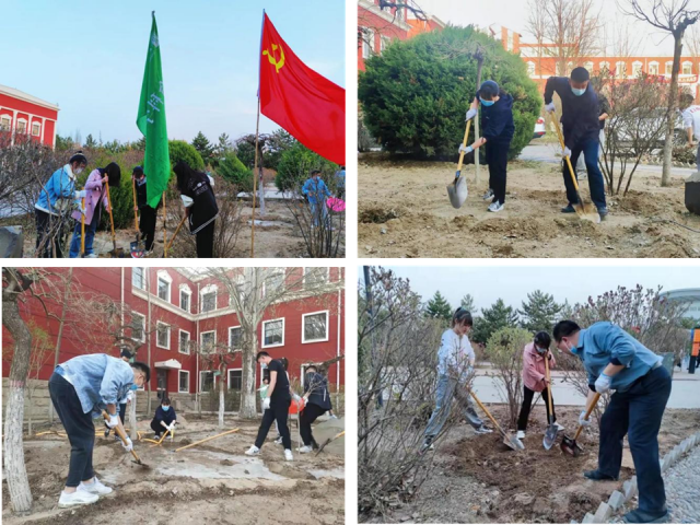 在博雅楼前的花园,学院领导和老师示范种植要领,同学们按照要求相互配合,有的手持铁锹翻土整地栽花,有的拿着水桶接水浇地,有的铺设花园里的小路,有的研究设计种植造型,大家干劲十足,精神饱满,经过近2个小时的紧张劳动,博雅楼前花园整洁干净焕然一新。
