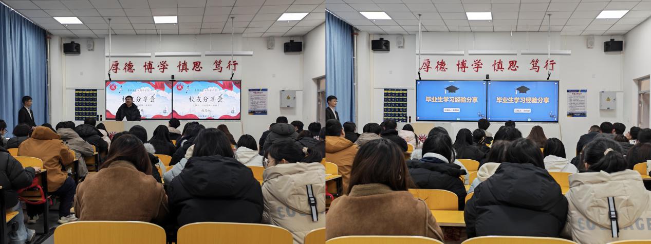 分享会上,赵思林以自身工作经历为切入点讲述实践的重要性,鼓励同学们无论是在学习还是工作中,要始终保持积极向上的心态和不断进取的精神。刘利娟以自身考研经历为切入点,讲述理论学习与实际锻炼相结合的重要性,分享自己的学习方法和经验,以及在面对困难时的应对策略。两位校友的交流分享中充满了智慧和启迪,使在座的每一位同学都深受启发。